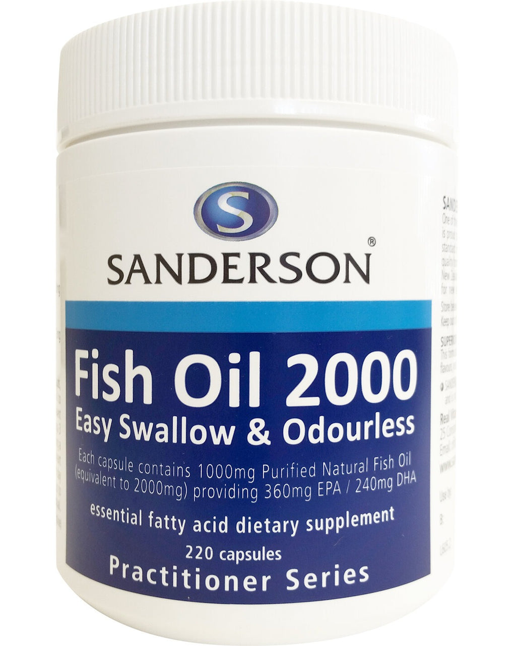 Sanderson SANDERSON Fish Oil 2000 220 Capsules is a high-potency omega-3 supplement designed to support heart, brain, and joint health. Each capsule delivers a concentrated dose of EPA and DHA, essential fatty acids known to promote cardiovascular function, cognitive performance, and overall wellbeing.